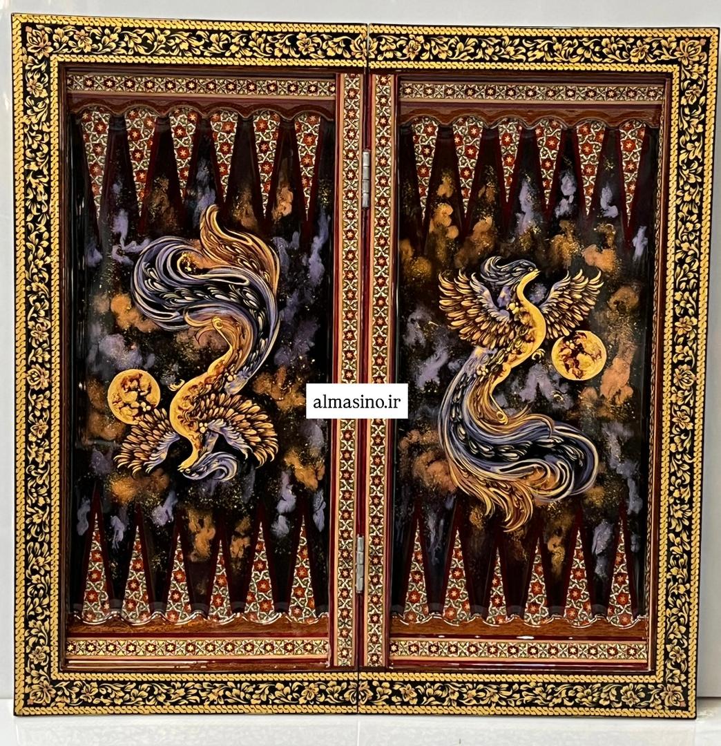تخته نرد خاتم طرح سیمرغ اعلا سایز ۵۰ سانتی کار فوق العاده زیبا و خاص طرح جدید کیفیت کار درجه یک به همراه مهره خاتم و تاس و ضمانت نامه