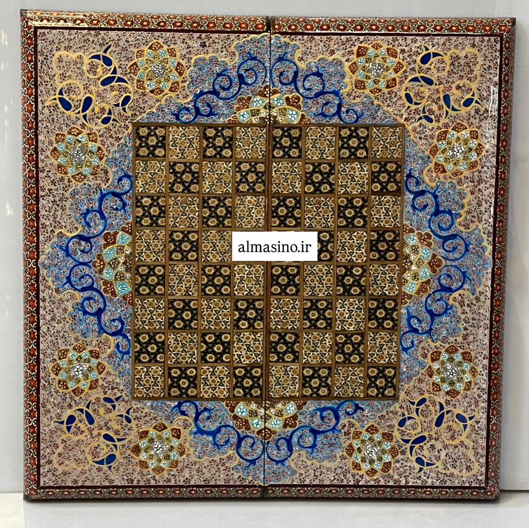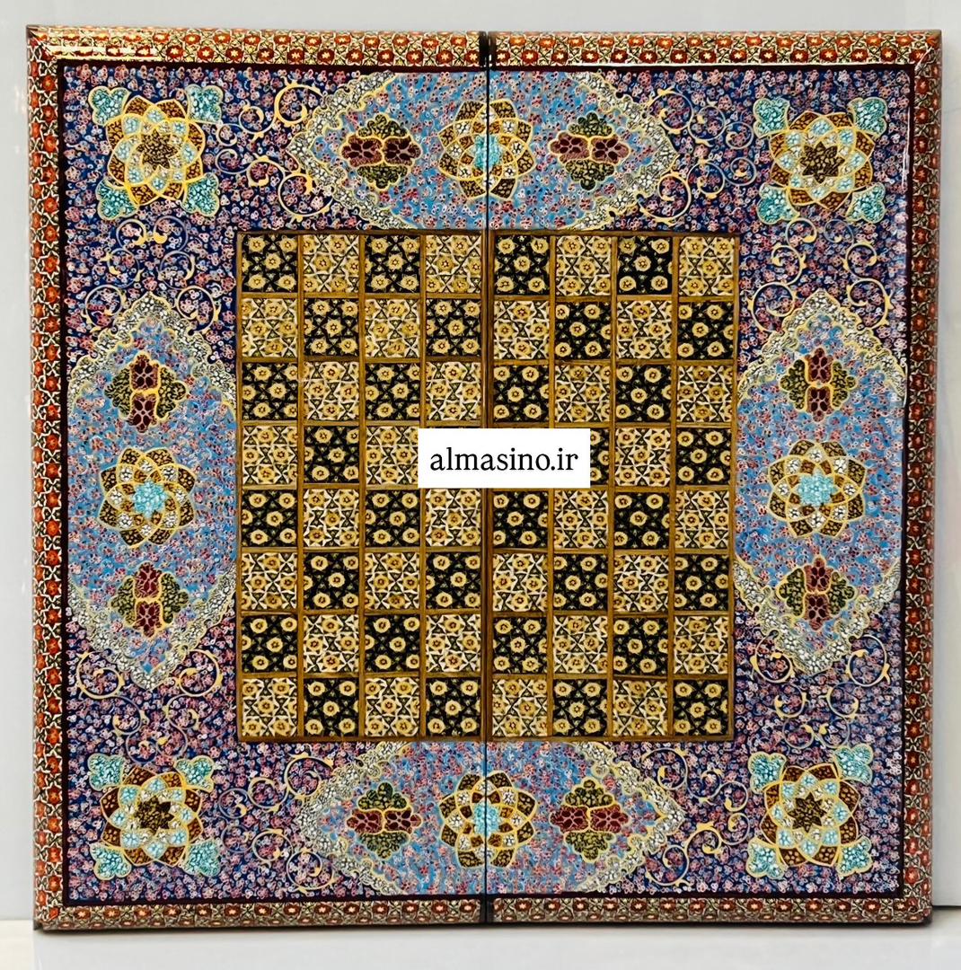 تخته نرد لب گرد خاتم و نقاشی تذهیب اعلا 50 سانتی زیر ساز بهترین چوب گردو داخل صدف با روکش پلی استر کیفیت تخته درجه یک به همراه ضمانت نامه