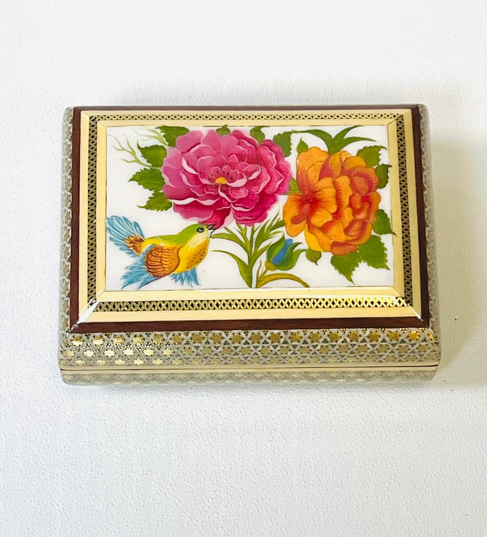 جعبه جا جواهری خاتم رو نقاشی گل سرخی  نفیس سفارش گالری ترنج ساخته شده در کارگاه اصفهان داخل و زیر جعبه خاتم کاری شده و روی جعبه هم با نقاشی طرح گل و مرغ درجه یک مزیین شده سایز جعبه 10/14