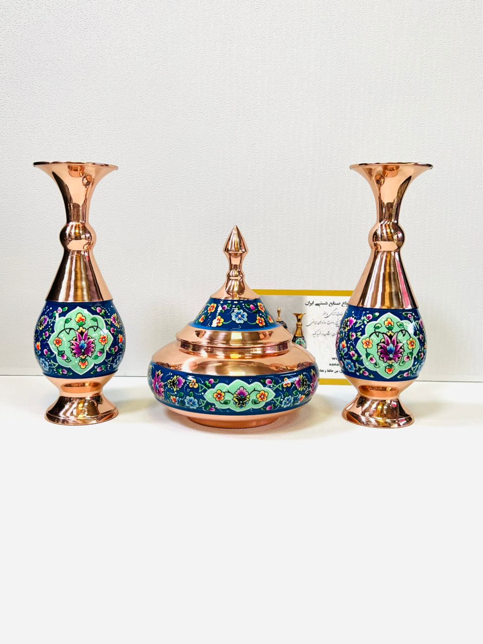 ست سه تایی مس و پرداز اعلا یک جفت گلدان ۲۰ سانتی با شکلاتخوری مدل سفینه ای ۲۰ سانتی فلز به کار رفته در محصولات مس اعلاء و با نقاشی طرح پرداز و روکش پلی استر صد در صد محصول کار دست و دارای شناسنامه اصالت کالا می باشد