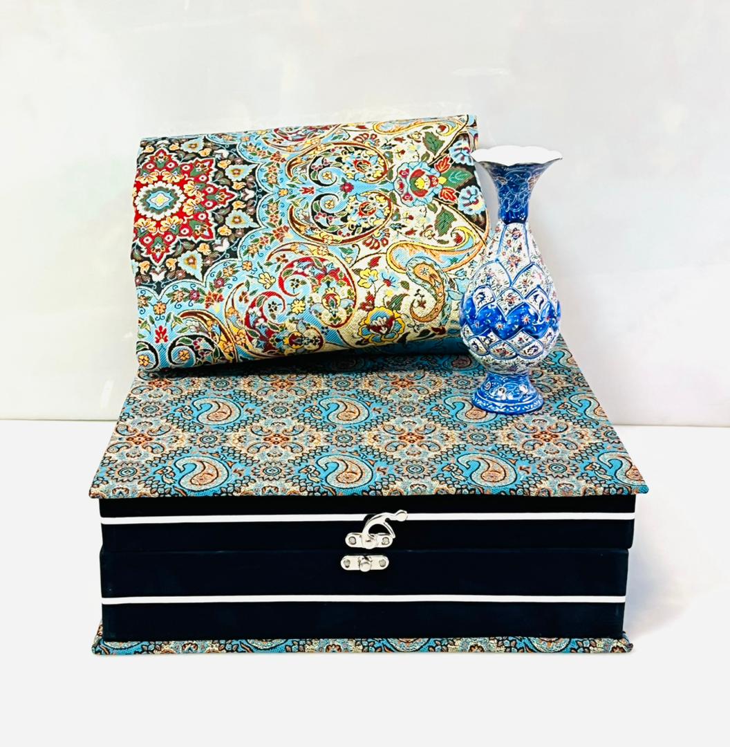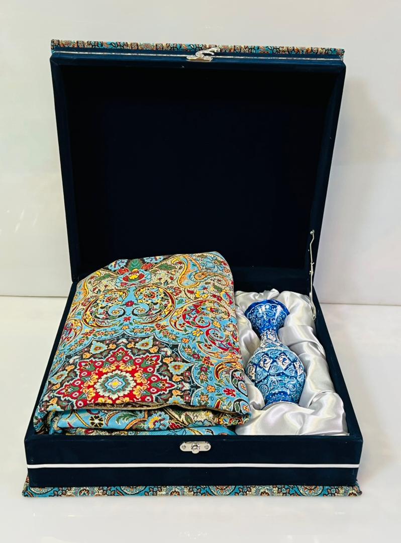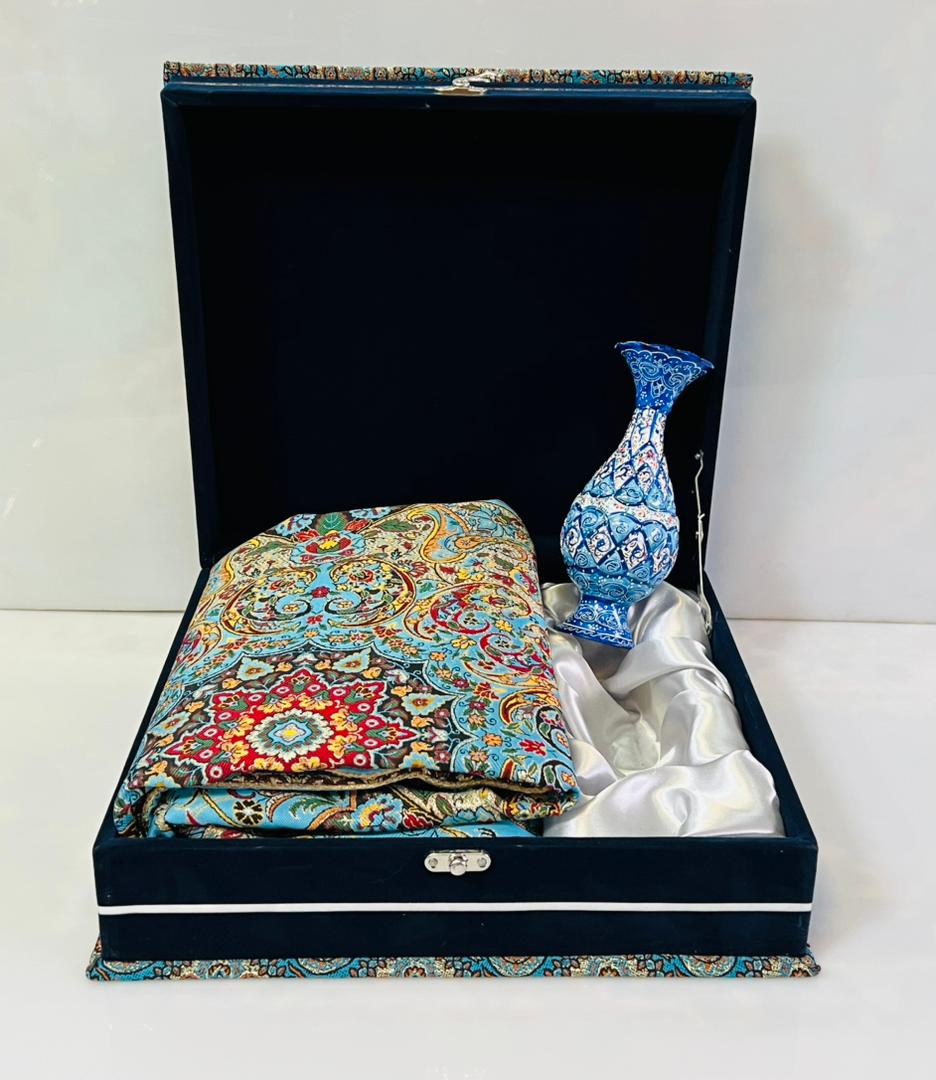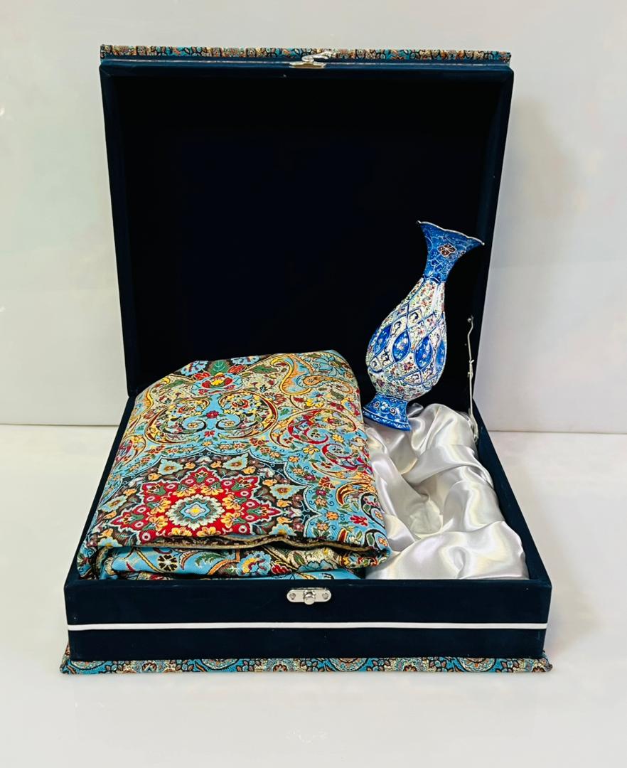 اگر به دنبال یک هدیه خاص و متفاوت هستید پیشنهاد ما برای شما این محصول اصیل و سنتی است . این ست هدیه زیبا شامل یک عدد گلدان مینا کاری در سایز ۱۶ سانتی و ترمه رومیزی ابریشم یک در یک