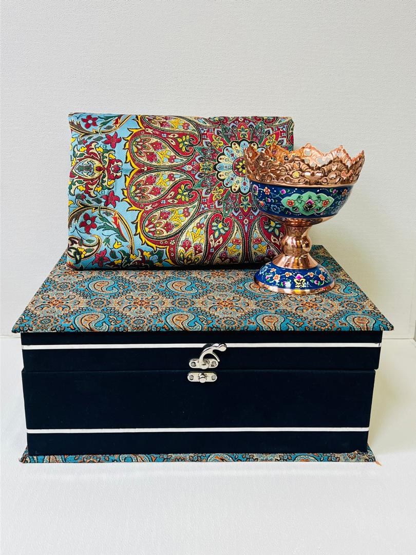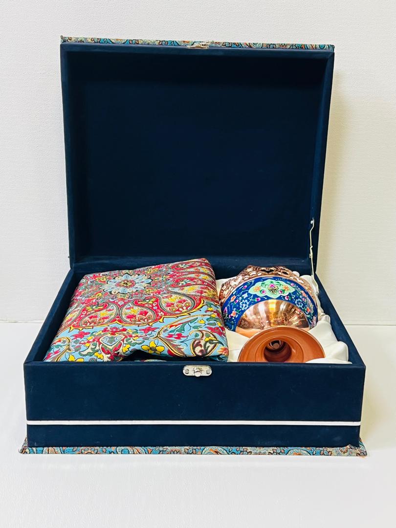 پک هدیه سازمانی اجیل خوری پایه دار ۱۳ سانتی مس و پرداز با ترمه ابریشم نفیس طرح افشاری سایز یک در یک و جعبه نفیس رو ترمه